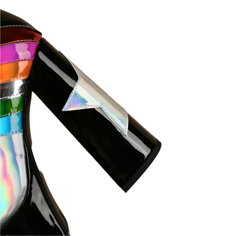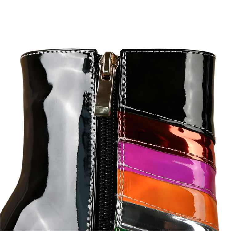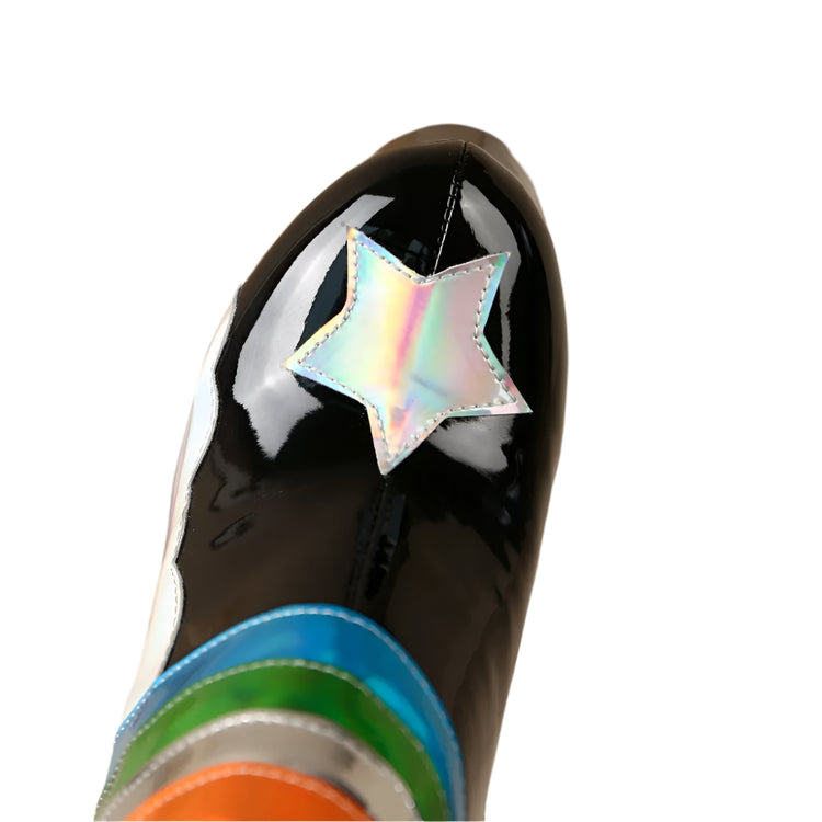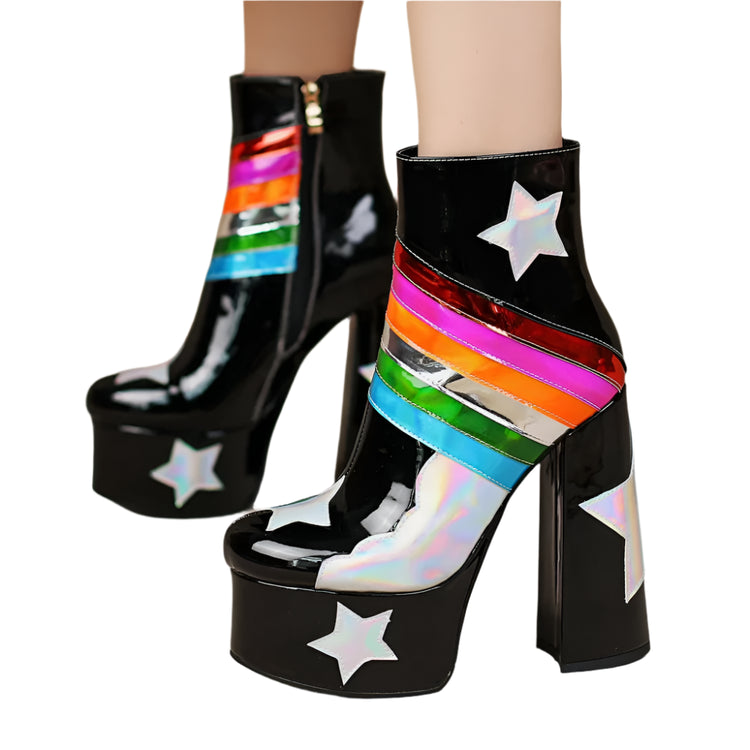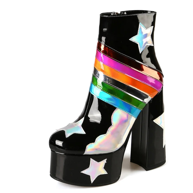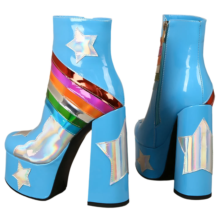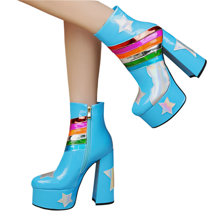 Step into a pastel paradise with these dreamy Rainbow Remains platform boots! These knee-high wonders are crafted in a soft baby blue that screams "sweet but psycho," while the rainbow accents add a touch of magic that'll make you feel like you're walking on clouds (or maybe rainbows!). With a platform sole that'll give you some serious height (and attitude), these boots are perfect for stomping through graveyards, skipping through cemeteries, or just adding a touch of ethereal edge to your everyday look. So ditch those black boots today and embrace the pastel side of darkness. Your inner rainbow goth will thank you.Ā